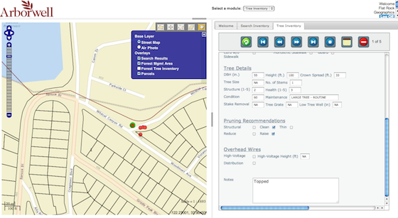 Highlights of the application are the ability to view and update the tree inventory being collected by Arborwell. After the initial inventory city staff will be able to generate inspection orders based on citizen reports and create routing maintenance plans for entire sets of trees based on GIS/map attributes.